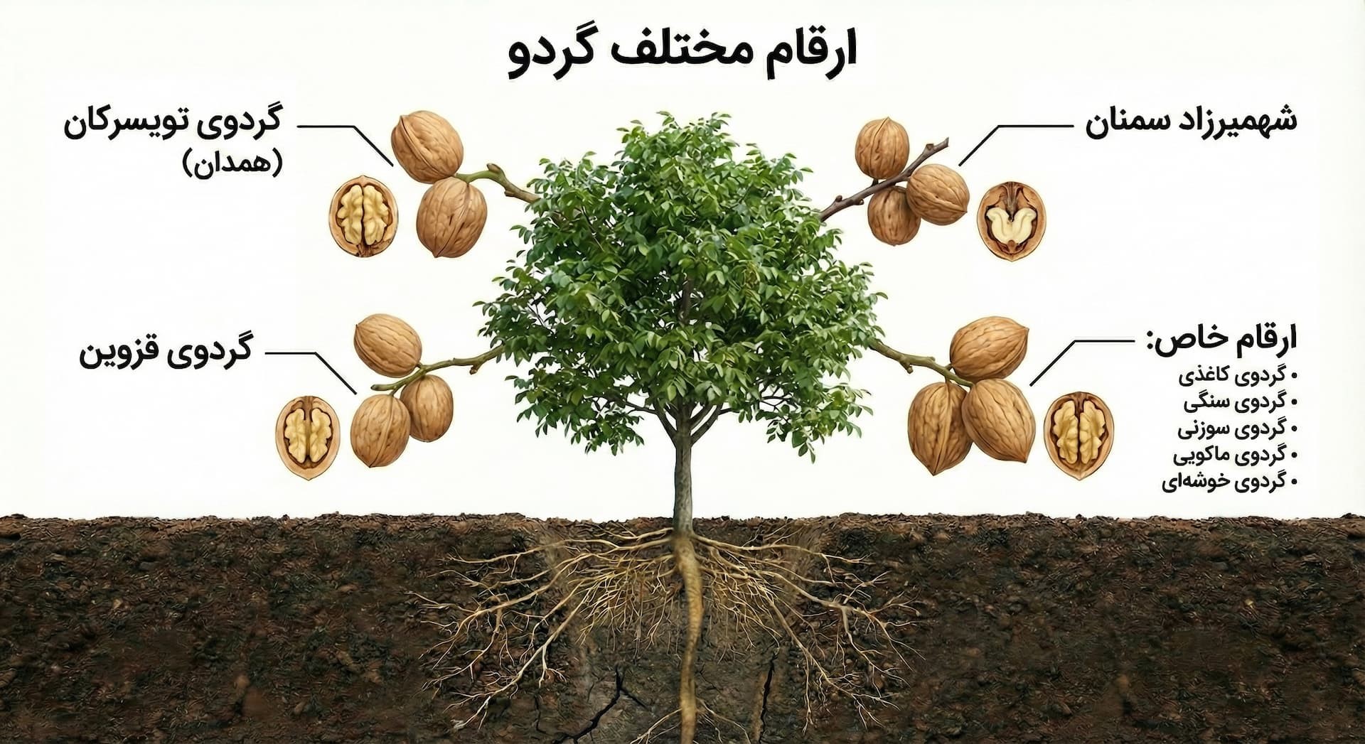 - ارقام خاص: گردوی کاغذی، گردوی سنگی، گردوی سوزنی، گردوی ماکویی و گردوی خوشهای.