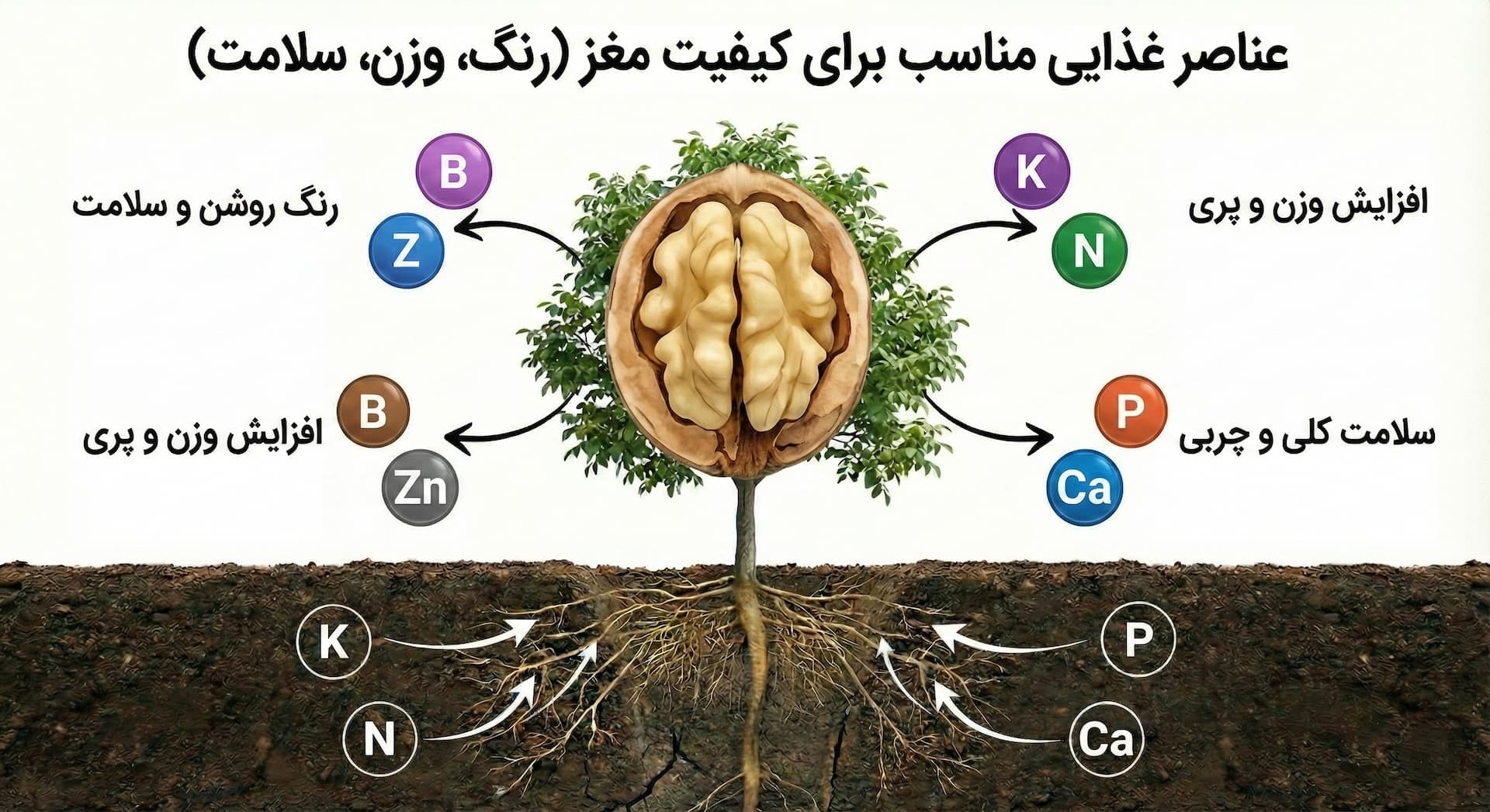 در نهایت، مشتری گردوی شما را میشکند و قضاوت میکند. اگر پوست سفت باشد، مغز سیاه باشد یا گردو پوک باشد، تمام زحمات آبیاری و کوددهی سالانه به هدر رفته است. بیایید ببینیم علم تغذیه چطور مشکلات کیفی مغز گردو را حل میکند: